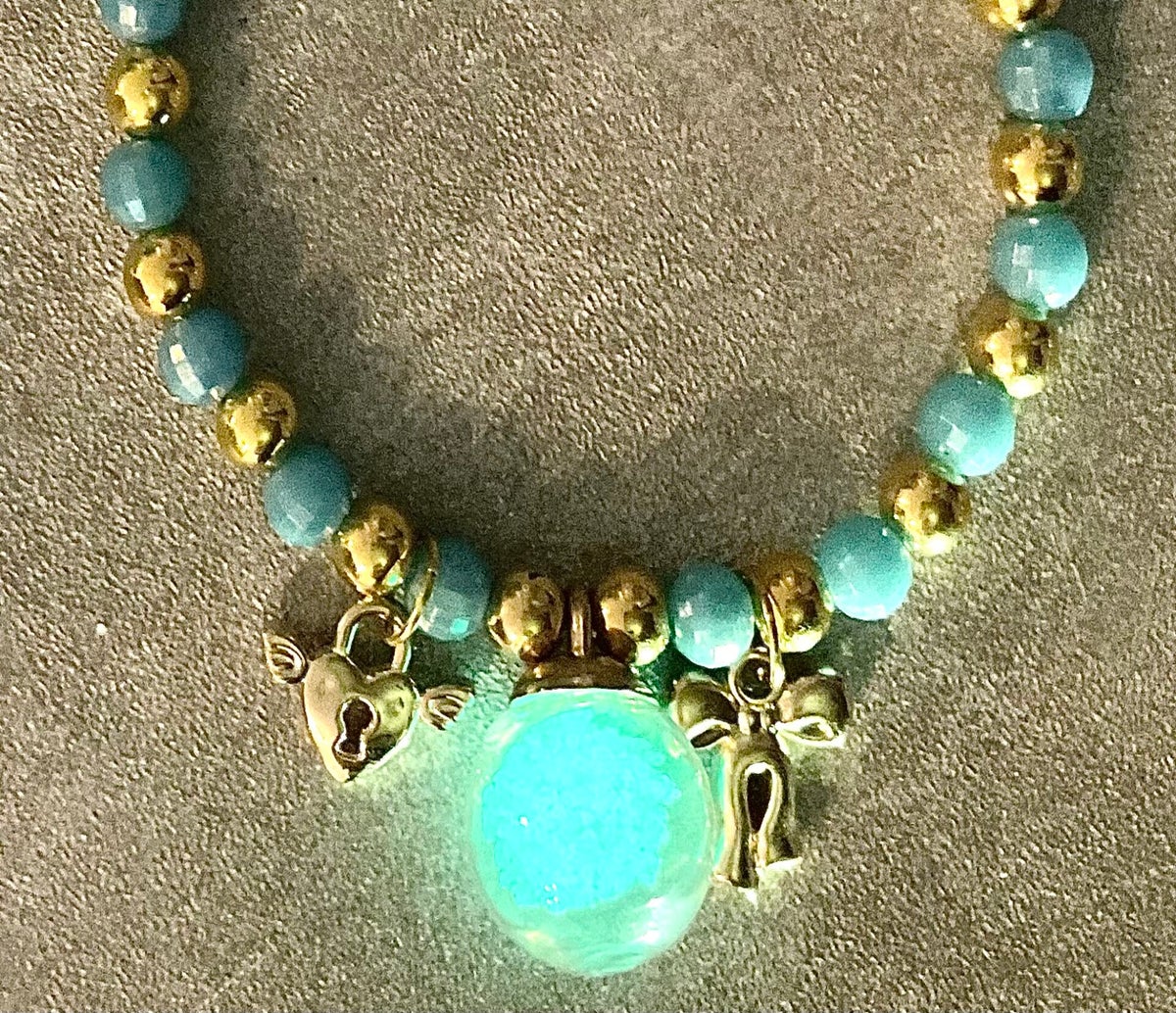 Besonderes Highlight sind die drei liebevoll gestalteten Anhänger: Zwei schlichte, goldene Anhänger rahmen den zentralen Anhänger ein, der in der Nacht sanft ✨leuchtet✨ und dem Armband einen magischen Charme verleiht.
